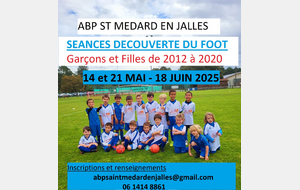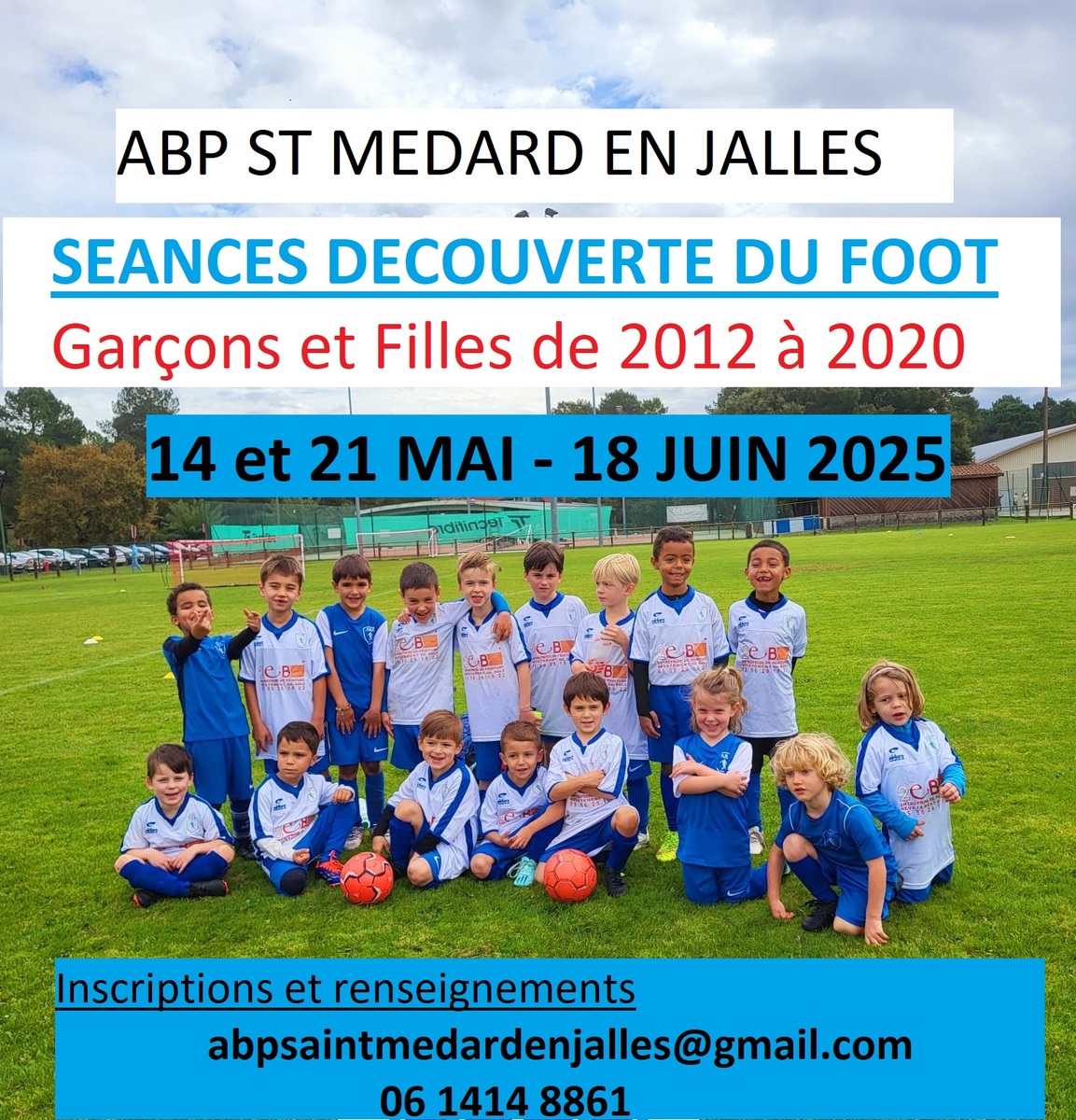 SEANCES DECOUVERTE DU FOOT et du CLUB. A partir du 14 mai nous accueillons tous les joueurs ou joueuses souhaitant s'essayer à la pratique du foot ou rejoindre notre club. Séance d'essai gratuite et sans engagement ouverte à toutes et tous 2012 à 2020. Prévoir une tenue adaptéé à la pratique du foot et à la météo et venir avec sa gourde d'eau. Contacts -Inscriptions 06 1414 8861 ou abpsaintmedardenjalles@gmail.com RESERVEZ VOTRE PLACE -Nombre de places limité par session.
